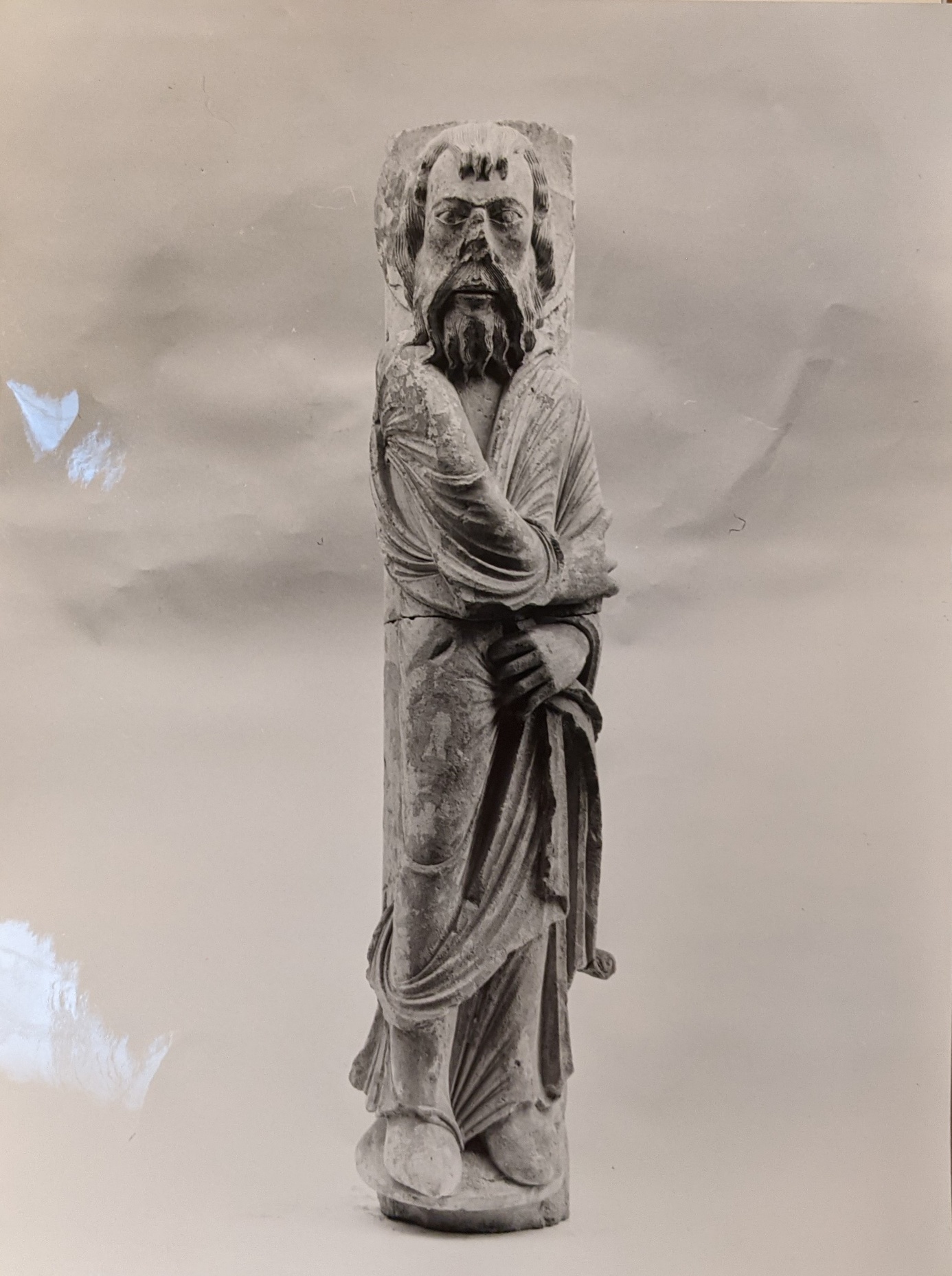 Un autre dossier d’œuvre illustre la perception des différents styles des figures sculptées. Intitulé Prophète furieux (fig. 8), la figure masculine est nimbée, chaussée et tient un phylactère à l’instar des autres prophètes. Le tapuscrit est composé des rubriques habituelles mais se conclut de la manière suivante : « Figure trapue, de proportions décroissantes de haut en bas : tête torse et bras énormes, membres inférieurs très courts. Attitude agitée et énergique. Cf. statues-colonnes n° »24 L’écriture dactylographique et la formulation d’attente révèlent un travail en cours d’observations et de comparaisons d’ordre stylistique. L’adjectif suggère une appréciation subjective qui a, par conséquent, été écartée du cartel de l’œuvre placée, dans le musée, à côté d’un autre prophète : Daniel. L’identification de Daniel est établie par Pressouyre dans un texte non publié conservé dans le dossier d’œuvre correspondant où l’on peut lire « [...] lorsque dans un cortège de vieillards barbus tenant des phylactères apparaît un adolescent imberbe et bouclé, il s’agit presque toujours de Daniel »25.
