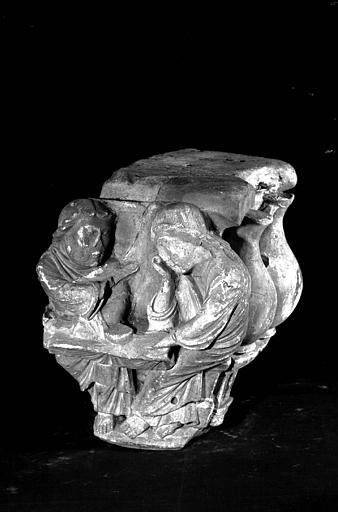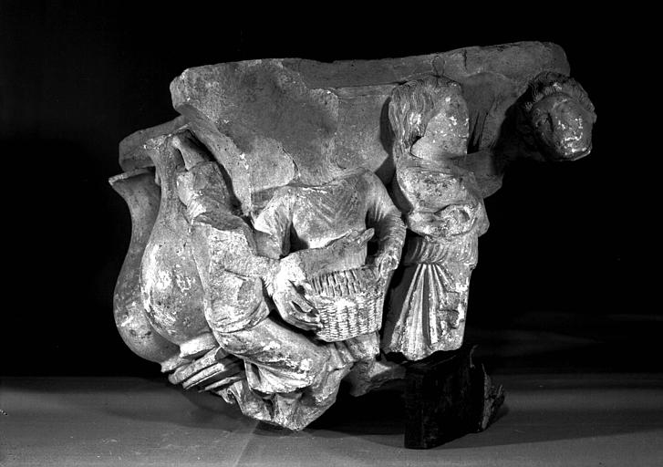 Avant les découvertes des Pressouyre, le corpus est donc déjà conséquent mais incomplet et particulièrement éclaté. Anne Prache signale qu’il est localisé tant dans des communes limitrophes de Châlons que dans la collection particulière de Raymond Pitcairn aux Etats-Unis. Elle rappelle les statues-colonnes remployées à l’église de Sarry ainsi que le chapiteau historié identifié par Amaury Thiérot sur la commune de Fagnières et que le conservateur de l’époque, Octave Beuve, fait entrer au musée municipal en 191212. Pressouyre déplore cependant qu’elle n’ait pas effectué de rapprochements entre les différents fragments à sa disposition pour recomposer des éléments complets. Il démontre que deux morceaux de chapiteaux présents dans le lot classé Monuments historiques en 1961 (fig. 1 et 2) présentent des joints vifs autorisant donc de les associer l’un à l’autre pour reconstituer une face d’un large chapiteau. Les jarres qu’ils ont en commun peuvent aisément être mises en rapport avec l’iconographie des noces de Cana. Ainsi recomposé, un élément, alors conservé au Louvre13 et visible sur la photographie du dépôt lapidaire de la tribune sud de la collégiale (fig. 3), peut être identifié comme appartenant à l’ensemble pour continuer de compléter ce chapiteau quintuple.