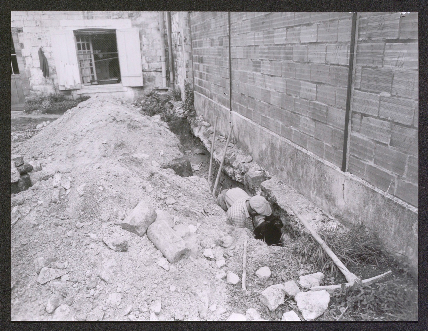 Au début de l’année 1963, ses démarches aboutissent à une autorisation et un financement de travaux dirigés par Paul Pillet, architecte en chef des Monuments historiques, pour sonder les murs du même bâtiment dans le jardin du presbytère. Après un sondage effectué le 27 mars 1963 qui permet une première découverte de fragment de base de colonne16, les recherches débutent au début du mois de mai et donnent lieu à 275 trouvailles durant les trente premiers jours. Des maçons appartenant à une entreprise privée agréée par l’administration des Monuments historiques réalisent des tranchées d’environ un mètre de large et de profondeur pour que les ouvriers se glissent à l’intérieur et sondent l’intégralité des soubassements des murs (fig. 4).