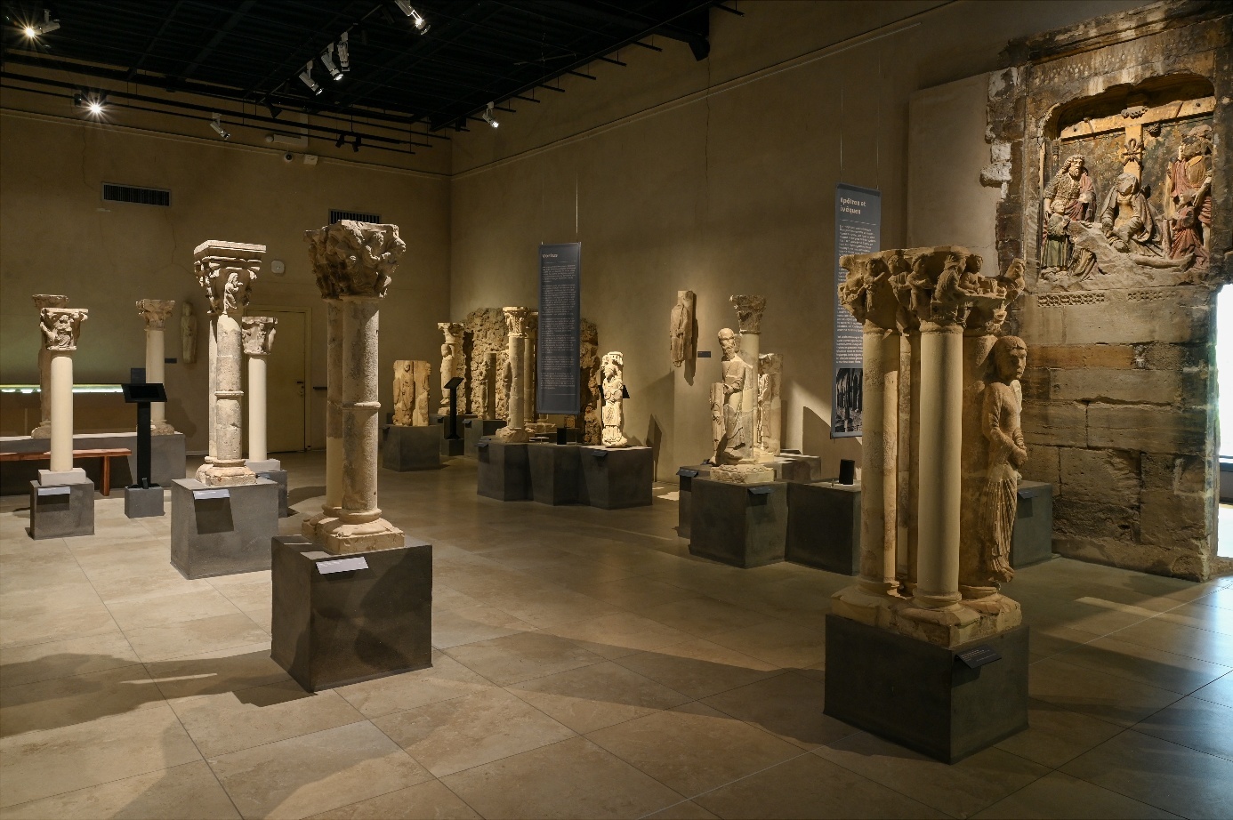 Les lignes droites des poutres I à profil normalisé (IPN), les parements neutres en ciment clair des murs et le carrelage commun aux présentations d’archéologie de cette époque fournissent un cadre considéré alors comme ayant la capacité de s’effacer derrière les sculptures. Ces dernières ont été fixées dans des blocs de béton gris ce qui confère un caractère figé à la muséographie car elles ne peuvent être déplacées à moins de travaux de grande ampleur. La conception d’un musée a beaucoup changé depuis cette époque et on pense de nos jours davantage à la nécessité de faire évoluer les modalités de présentation des œuvres. Confrontée aujourd’hui à des exigences fortes des différents publics envers l’expérience de visite, cette présentation fixe peut être jugée contraignante ainsi qu’inaccessible pour le grand public. Par le biais du numérique, l’équipe curatoriale s’est donc attachée entre 2022 et 2025 à fournir des dispositifs à même de redonner à ce corpus d’œuvres son statut de trésor inestimable et unique au monde. La réflexion menée dans le cadre de cette modernisation du musée aboutit au choix de conserver la muséographie originelle, préservant ainsi un niveau de lecture à part entière du lieu, celui d’un musée lapidaire comme outil historiographique de la sculpture du premier âge gothique.